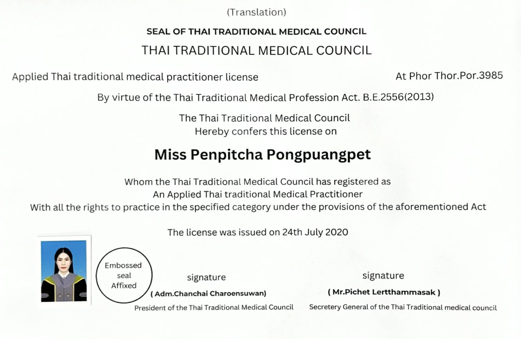 She has a Bachelor of Applied Thai Traditional Medicine from The Mahasarakam University Faculty of Medicine, which is available for viewing below.